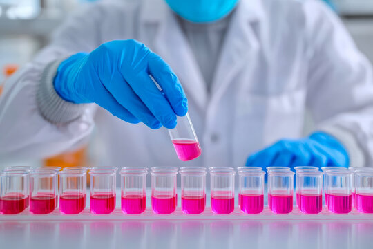 biotechnology laboratory with cell culture and biological sample. Scientist handling biological sample for cell culture analysis in sterile biotechnology lab