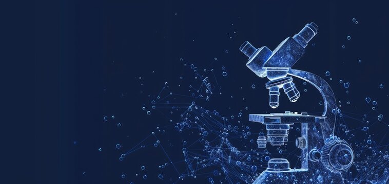 A microscope stands ready to explore the intricate structure of a DNA double helix, a symbol of lifes blueprint, against a backdrop of swirling blue particles