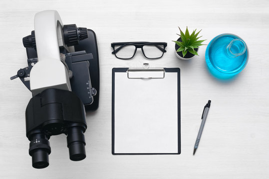 Laboratory table with a blank paper sheet of researching results, microscope and a chemical reagent liquids background with copy space. Medical examination mock up.