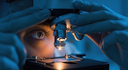 A female scientist looking through a microscope in a dark laboratory. Close-up of an eye analyzing a medical specimen. Scientific research and discovery concept