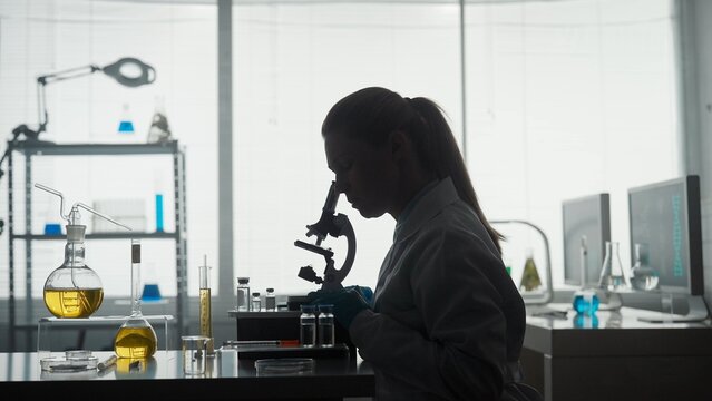 Medical scientific laboratory. Side view of a dark silhouette of a female scientist looking under a microscope, doing an analysis of a test sample.
