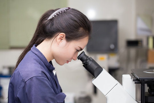 female scientist looking in microscope in laboratory Laboratory