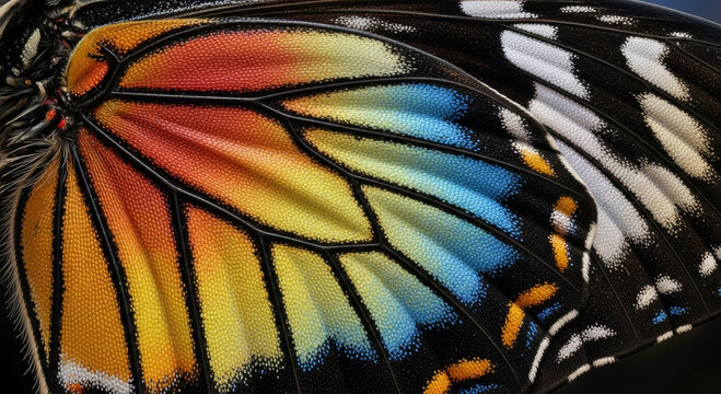 Macro detail of colorful butterfly wing texture with orange and blue scales