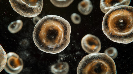 Microscopic View of Translucent Cells Floating in Dark Fluid Detailed Cellular Structures