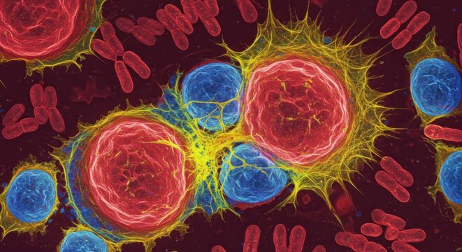 Cellular Symphony: Microscopic view of vibrant cells reveals an intricate structure, a mesmerizing array of colors and forms within the body, evoking a sense of curiosity and wonder.