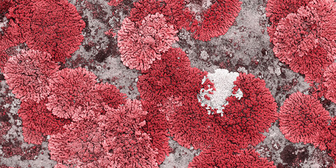 Monochrome nature patterns of colored mosses and lichens, natural texture background, Close-up surface covered with white pink color moss, macro short, top view banner micro plants natural