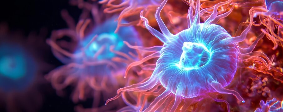 Coral polyps glowing fluorescent blue and purple, bioluminescent microscopy art