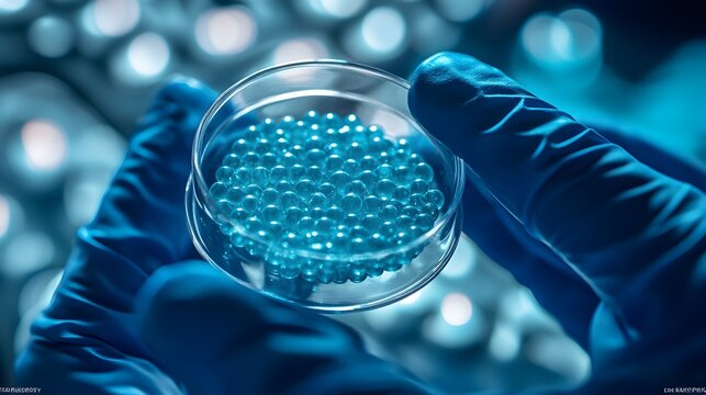 A scientist's gloved hands carefully hold a petri dish filled with vibrant blue microspheres in a modern laboratory setting.