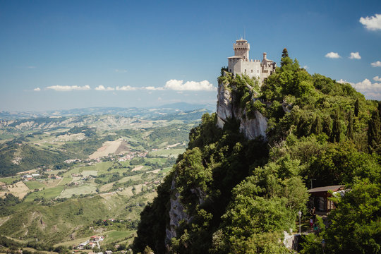 Castle of San Marino on the hill. Republic of San Marino is an enclaved microstate surrounded by Italy, situated on the Italian Peninsula on the northeastern side of the Apennine Mountains