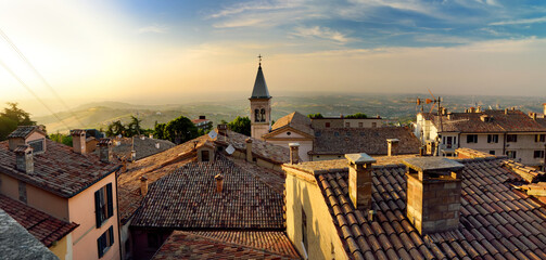 Sunset view of San Marino microstate and Emilia-Romagna region of Italy from the rooftops of the city of San Marino.