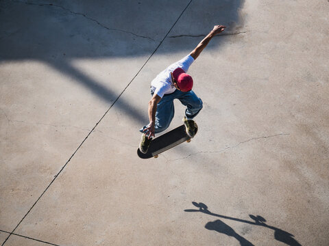 Skateboarder performing trick in sunlit skatepark