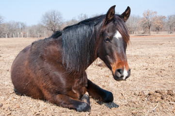Dark bay horse in his winter coat taking a midday nap in pasture