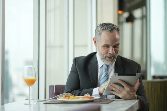 Caucasian Businessman using tablet computer. Happy middle aged man sitting in a restaurant. Entrepreneur working online, reading finance report, thinking.