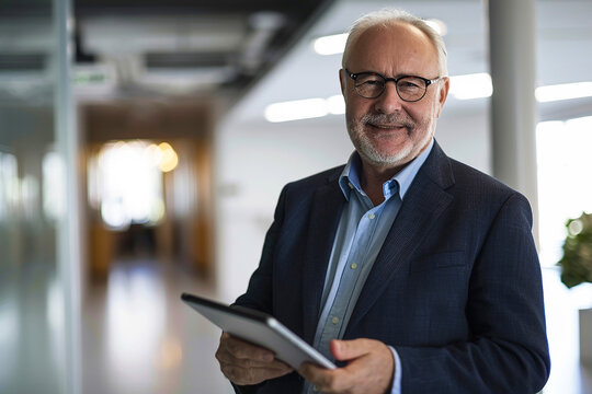 Busy mature older business man executive standing in office using digital tablet. Middle aged professional businessman corporate manager wearing suit and glasses holding tab working on finance project