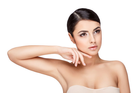 Portrait of beautiful indian girl. Young hindu woman model with golden kundan jewelry set, earrings, tikka and bracelet  . Traditional India costume lehenga choli or saree . Curly hair
