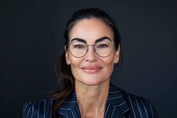 Close-up portrait of a middle aged woman of Middle Eastern descent, studio photo, against a sleek gray studio backdrop