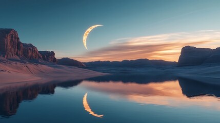 A glowing crescent moon reflected in a calm desert oasis