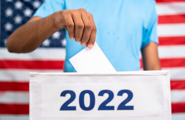 Man placing ballot paper into 2022 ballot box in front of american flag - concept of 2022 midterm US election, voting and democracy