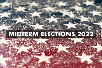 Text midterm elections 2022 on a grungy print of stars from the american flag with horizontal red light leak. Concept of political division during elections in the United States.