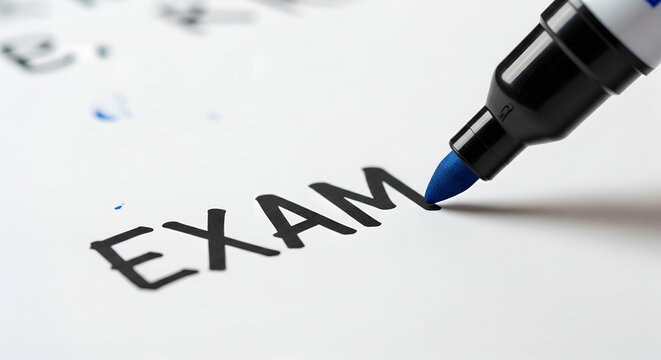 Close-up of a marker with a blue tip writing the word EXAM in black ink. Concept for academic tests, final assessments, and educational pressure.
