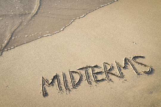 'MIDTERMS' written in the sand on the beach with the sea washing up the shore.