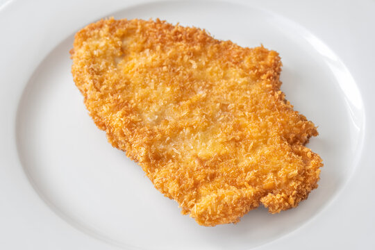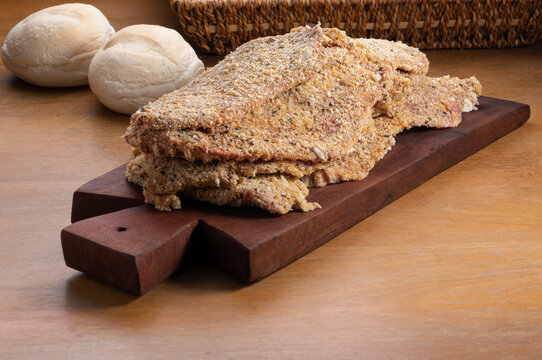 breaded cutlet, cotoletta alla milanese with fries on a brown wooden table
