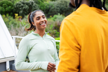 Diverse friends holding water bottle and chatting by white railing outdoors copy space