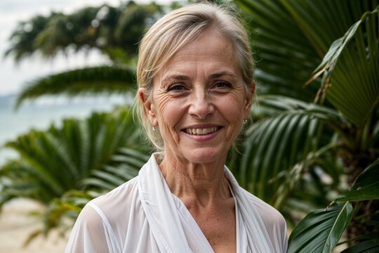 elderly old woman in on the beach wearing beachwear on a tropical vacation, being healthy and living a good life