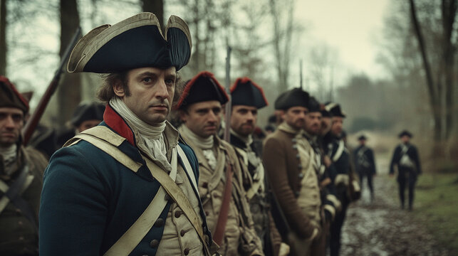 American Colonists in Revolutionary War Uniforms on Battlefield