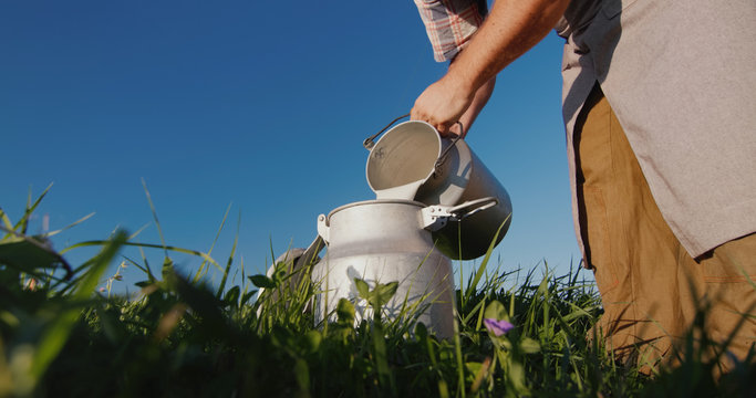 Farmer pouring raw milk into container with milking machine milking in dairy farm.