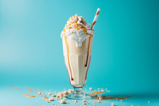Creamy vanilla milkshake topped with whipped cream and caramel drizzle, served in a tall glass against a vibrant blue background