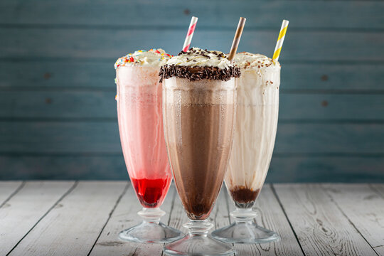 Three glasses of milkshake with assorted flavors. Chocolate, vanilla and strawberry milkshake.