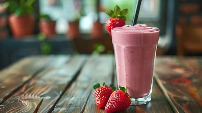 Glass with strawberry smoothie or milkshake on wooden table