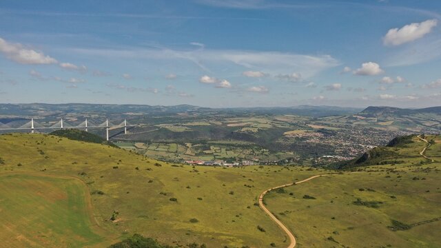 Full of forests and cultivated fields Tarn valley with river spread out under tallest bridge of world - Millau Viaduct. Aveyron, Occitania, France