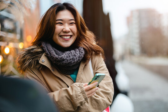 Cozy style girl portrait with her mobile phone and happy expression for on transparent background
