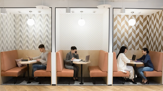 Multiethnic freelancers working in separate booths in modern freelance co-working office space, sitting at workplace tables divided by walls, using laptop, smartphone, meeting, talking