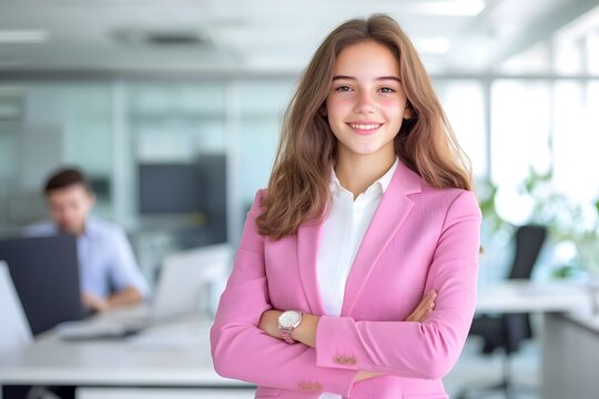 Confident and Successful Young Female Business Executive Wearing a Stylish Pink Tailored Suit in a Sleek and Modern Office Environment with Glass Partitions and Soft Ambient Lighting