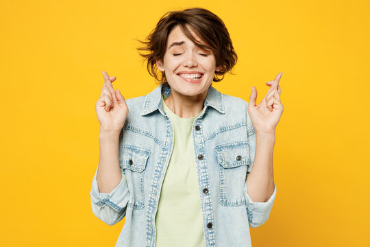 Young worried woman wear green t-shirt denim shirt casual clothes waiting for special moment, keeping fingers crossed, making wish, eyes closed isolated on plain yellow background. Lifestyle concept.