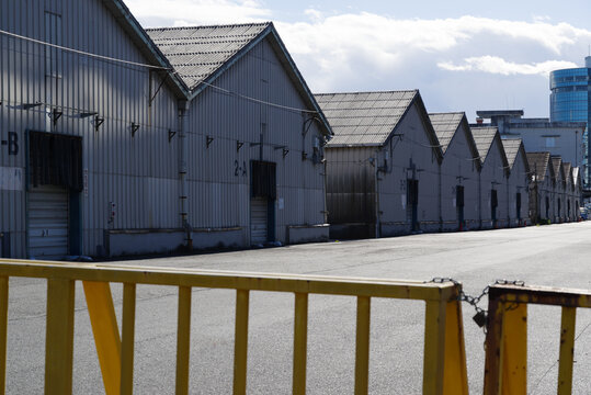 三角屋根の倉庫が港に建ち並ぶ 港区、海岸地区の風景
