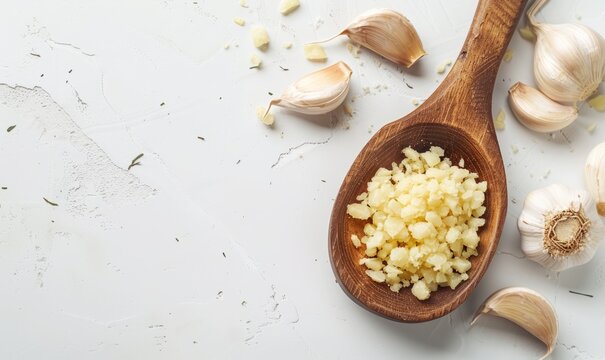 Wooden ladle with minced garlic on a white desk with a plain background, presenting a top view of the copy space imag