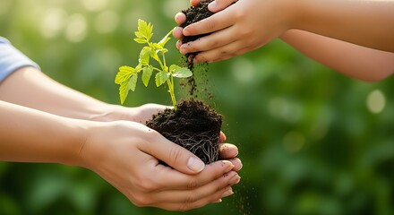 Caring hands, both adult and child, gently nurture a small green plant, embodying environmental responsibility, growth, and a sustainable future for our planet
