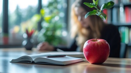 Focused Student Studying in Library with Apple on Desk and Open Book