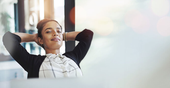 Business woman, relax in office and peace with corporate attorney, wellness and banner with mockup space. Rest, sleep and lawyer on break, bokeh and meditation with mindfulness in the workplace