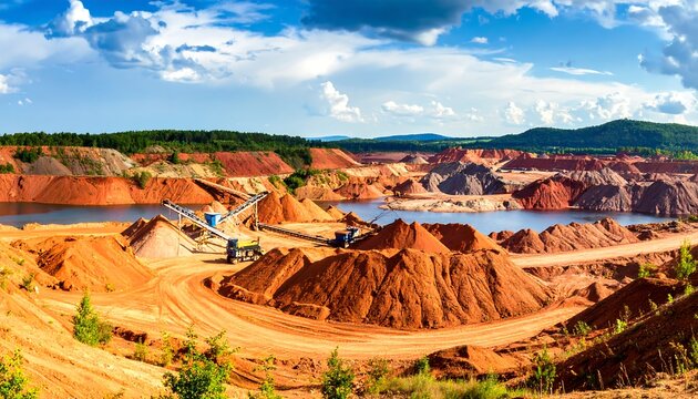 Aerial view of sandpit and factory plant producing sand materials for construction industry. Top view of industrial place. Photo captured with drone.