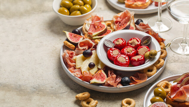 Appetizers, antipasti, snacks and cocktail glasses. Bruschetta, cold cuts of prosciutto, cheese, tuna fish stuffed mini bell peppers, olives, grapes and figs. Italian aperitivo. Copy space.