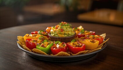 A stylish appetizer table featuring stuffed mini bell peppers, filled with cream cheese and herbs, arranged on a rustic wooden board, surrounded by dipping sauces and garnishes,