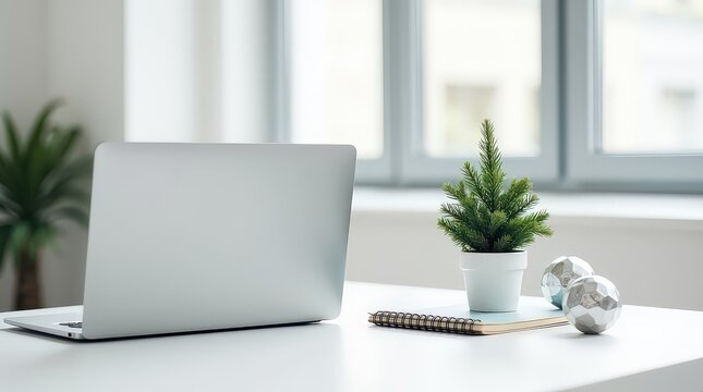 Cozy hot chocolate with whipped cream on a wooden desk next to a festive mini Christmas tree and a laptop with holiday wallpaper, creating a warm winter atmosphere