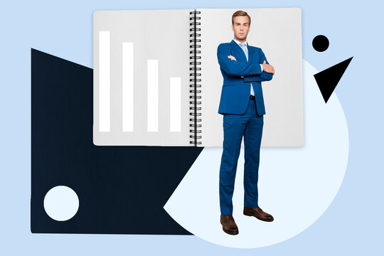 Creative retro 3d magazine collage of serious guy arms folded showing graphs presentation isolated pastel color background