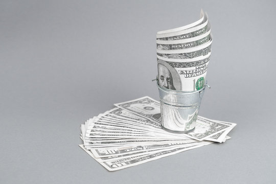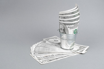 Money in the mini bucket, American banknotes, concept of investment, finance, taxes.