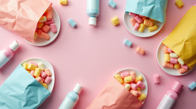 A delightful pink cup brimming with colorful mini marshmallows, set against a soft pastel backdrop, evoking feelings of whimsy, joy, and nostalgia in a playful manner.